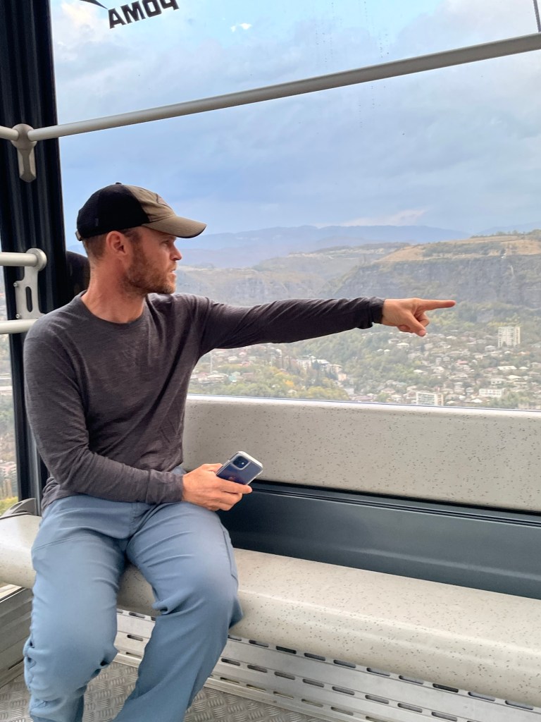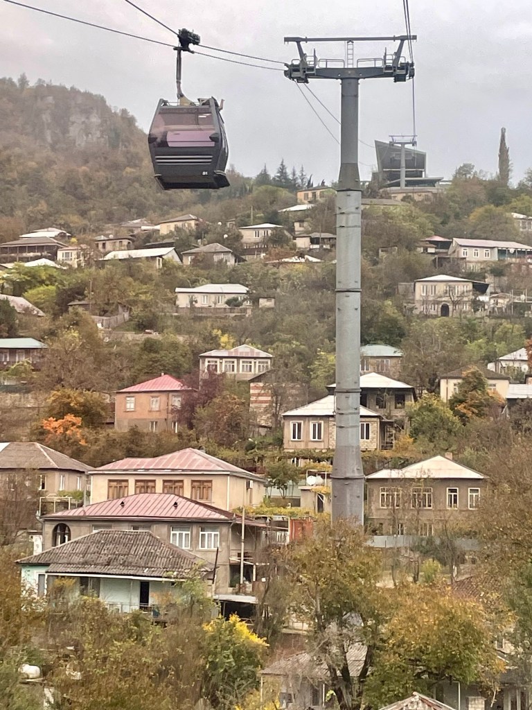 Once we finished our trek in Mestia it took one travel day to get back to Kutaisi and then on to the town of Chiatura. Chiatura is a bit off the normal tourist loop, which is one reason that it appealed to us for a quick stopover. However, it was the seventeen cable cars that have provided public transportation for this town that really caught our attention! As an old Soviet mining town, Chiatura created the world’s largest system of cablecars that led from the town in the valley up to the mines in the hills above. This made it quick and easy for the miners to get to and from work. As the town began to expand, buildings and apartments were also built at the top of the hill and these cable cars were used as public transport for these miners to get into town for food and entertainment. All of the original cars are now out of service, however, four state-of-the-art new cable cars have been built and recently opened to continue the cable car history and to continue to serve as public transportation for residents of Chiatura.