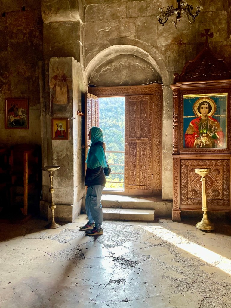 Our final stop was Mghvimevi monastery, which is a 13th-century Georgian Orthodox Church that is built inside of a cave fifty meters up a cliff overlooking the valley below. We arrived a bit before the official opening time, so we were the only ones at the church. Luckily, the opening time seemed inconsequential and we were allowed in the main chapel of the cave without any questioning. The larger monastery is still functioning and is off-limits to visitors. The main chapel is small, but we found it quite interesting due to both the remarkable location it is built into the cliff face, as well as the historical age and artifacts that still remain.
