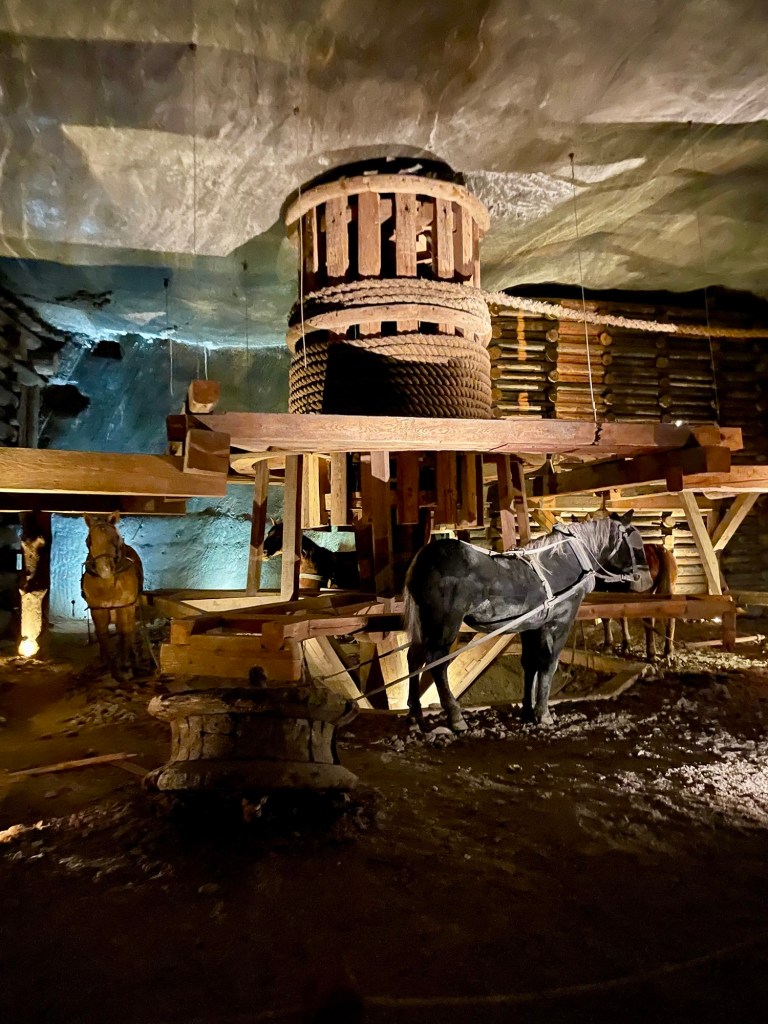 The highlight of the tour for me was the underground church of St. Klinga’s Chapel. Everything in this Chapel is made of salt including the carvings on the walls, statues, altar, and even the chandeliers. It was a stunning place to behold. By the time we ended our tour, we were on Level Three, which was 135 meters underground, and the location of a huge banquet hall, modern toilets, and food hall. It really blew my mind how much they were able to do so far underground. Luckily, they allow guests to hop on an old open-air mining elevator to exit the mine and come back up to the surface, which is one of the highlights of the tour.
