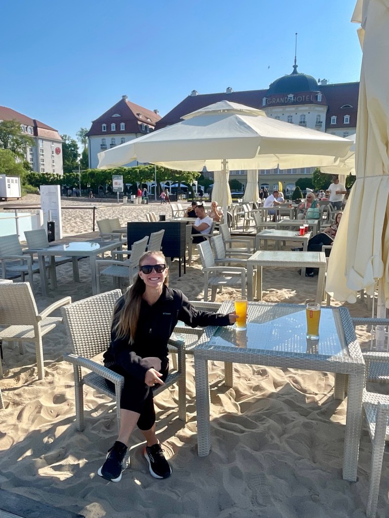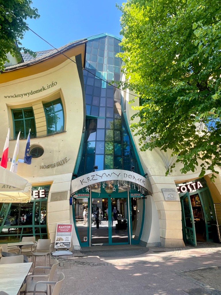 In the afternoon, we caught a short train up the coast to the small historical beach town of Sopot. This is a holiday destination where locals flock to the beach in the summer months. The beach was very large with cafes and restaurants where you could put your toes in the soft white sand. They also have a long pier that goes out into the ocean that you can pay to walk. The small town is notorious because Hitler stayed for one week during WWII at the opulent beachside Grand Hotel back in 1939. This beautiful historic property has since hosted many famous figures including Stalin, and more recently Shakira. Despite the beautiful beach and historic hotel, the main reason we came to visit was that Nate heard about the Krzywy Domek, or “crooked house” in Polish. It turns out that this unique architectural building is the entrance to a small shopping mall, and it felt like we stepped into a Dr. Seuss novel when we finally found it. For our final evening in Poland, we had a lovely pizza dinner back in Gdansk watching boats sail up and down the canal.